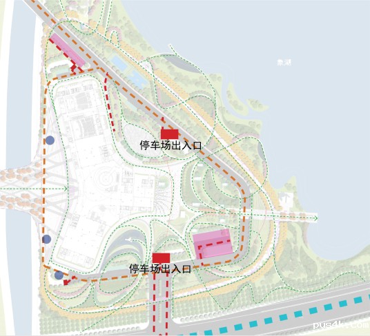 车辆可经由科技馆南门或西北门驶入,通过车辆智能道闸识别后,进入场馆内部道路。到达科技馆观众车库入口时,会有地面停车场引导人员对车辆进行分流。车辆从观众车库的南、北入口进入后,行驶至负一层车库地下平面,此时停车引导员将按照智能车库停放要求进行有序分流。