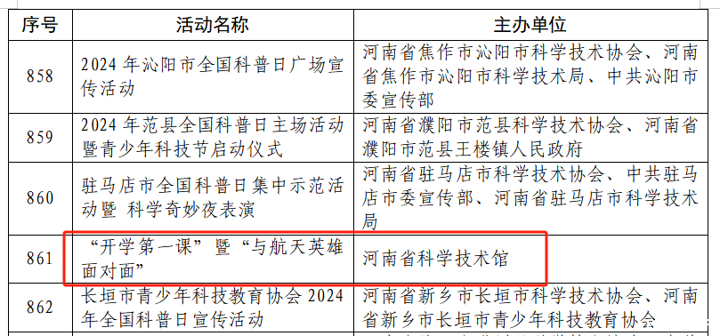 近日,中国科协办公厅发布《中国科协办公厅关于对2024年全国科普日有关组织单位和活动予以表扬的通知》(科协办函普字〔2024〕91号),对2024年全国科普日有关组织单位和活动进行表扬。河南省科技馆获评2024年全国科普日优秀组织单位,“开学第一课”暨“与航天英雄面对面”活动获评2024年全国科普日优秀活动。